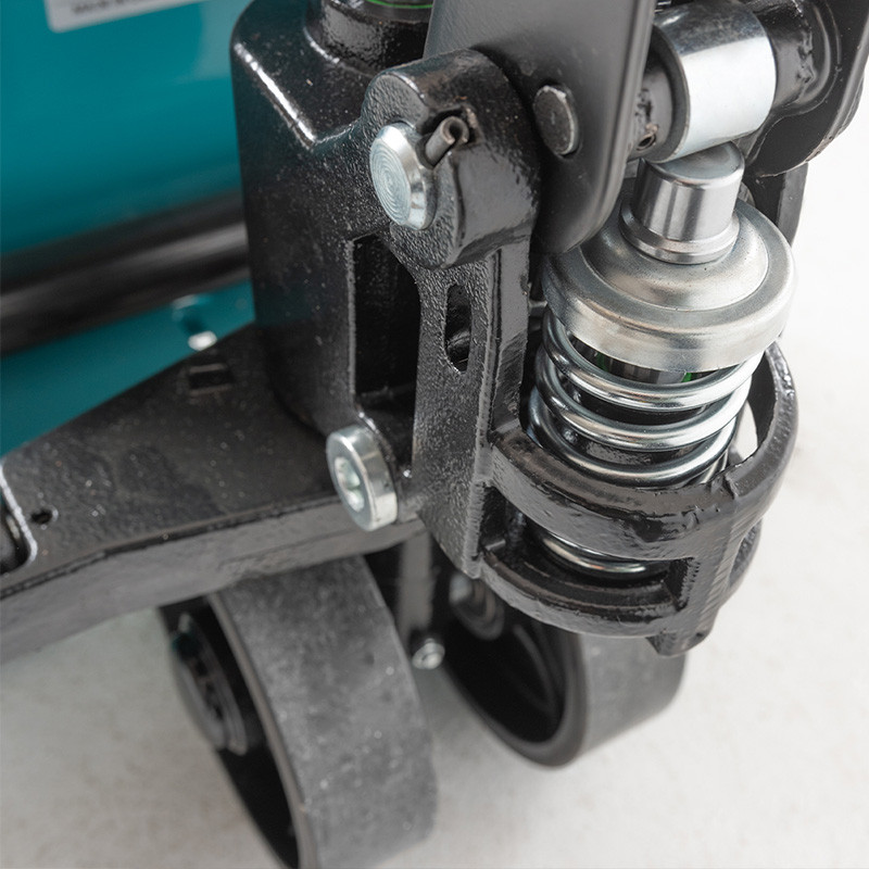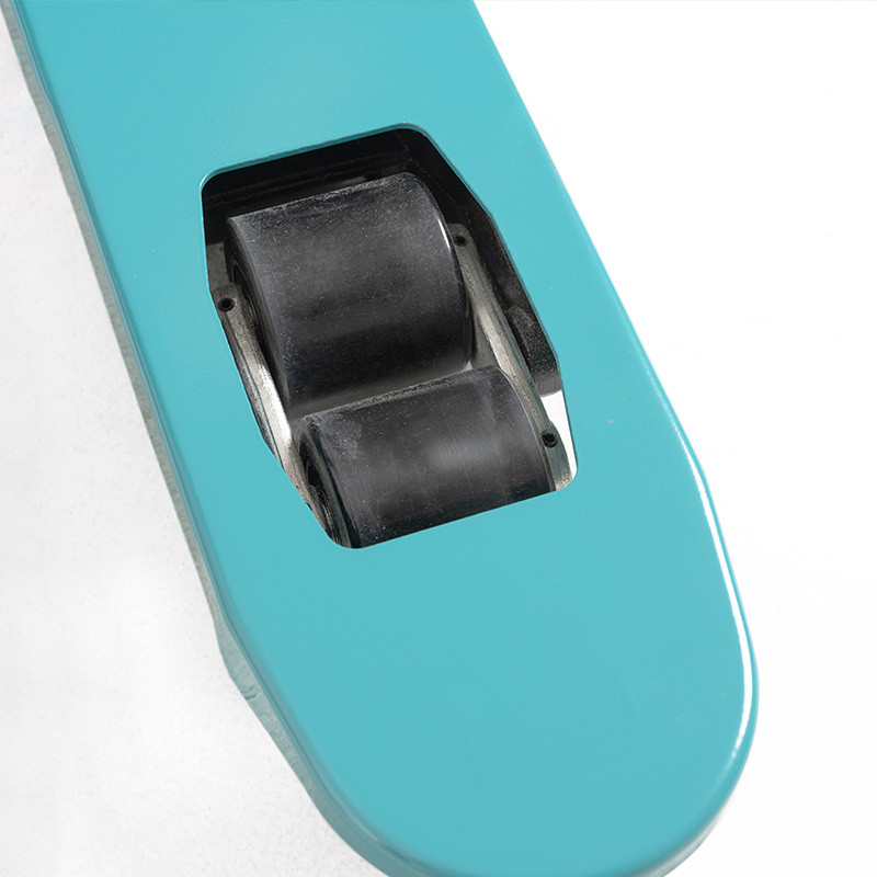 El sistema de ruedas incluye una rueda de guiado de poliuretano (Steer PU Wheel) y una rueda doble de carga de poliuretano (Load Double PU Wheel), que aseguran una maniobrabilidad ágil en espacios reducidos y un rodamiento suave, reduciendo el desgaste durante el uso continuo. Además, este sistema permite la entrada lateral a los palets.