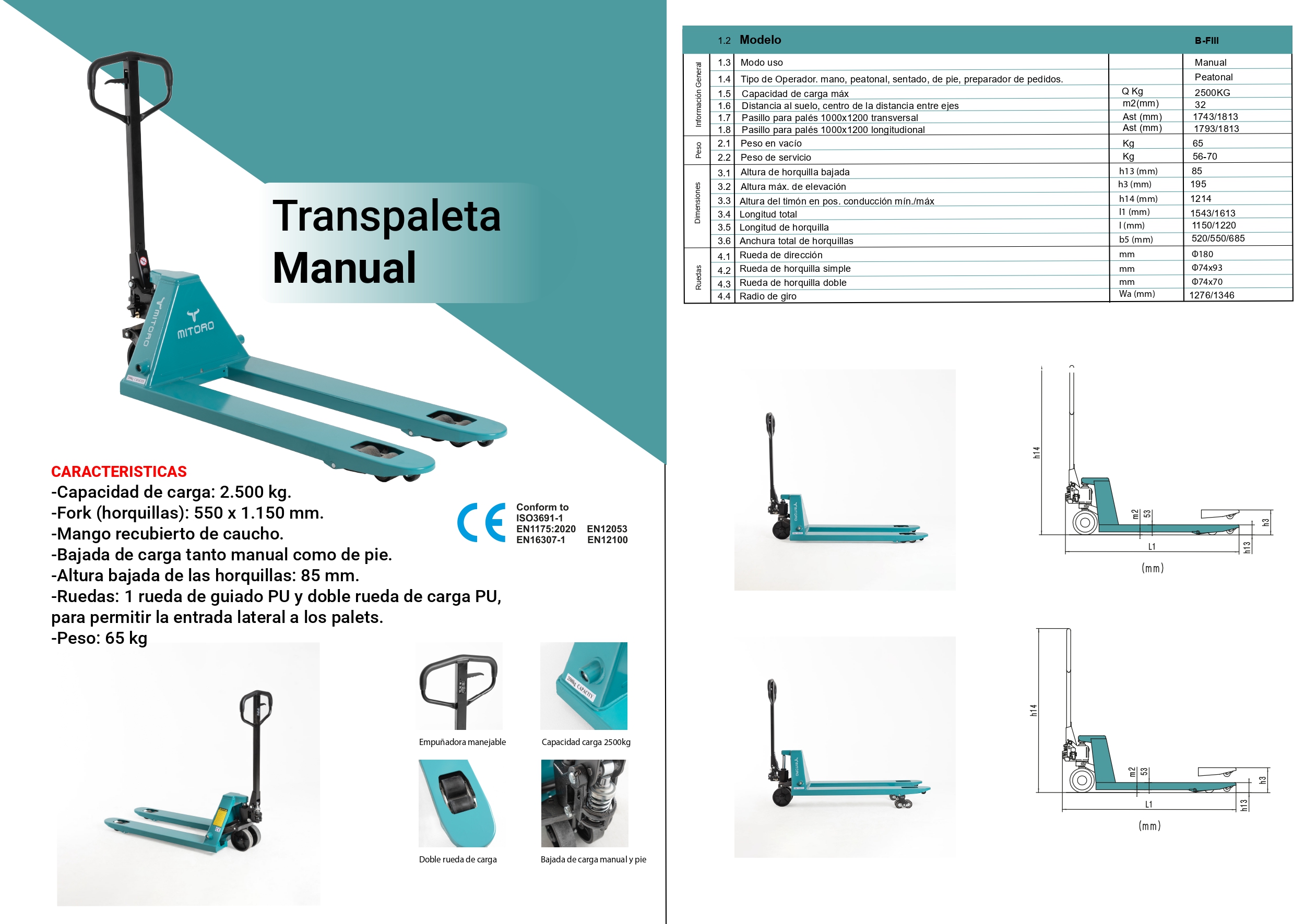 Características destacadas: Capacidad de carga: 2.500 kg. Fork (horquillas): 550 x 1.150 mm. Mango recubierto de caucho. Bajada de carga tanto manual como de pie. Altura bajada de las horquillas: 85 mm. Ruedas: 1 rueda de guiado PU y doble rueda de carga PU, para permitir la entrada lateral a los palets. Peso: 65 kg.