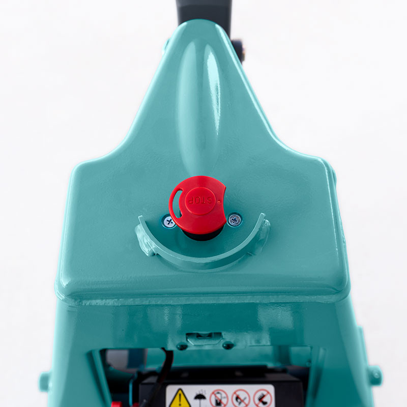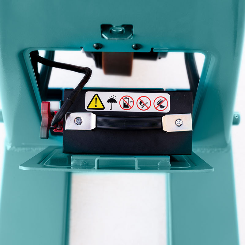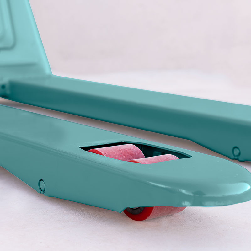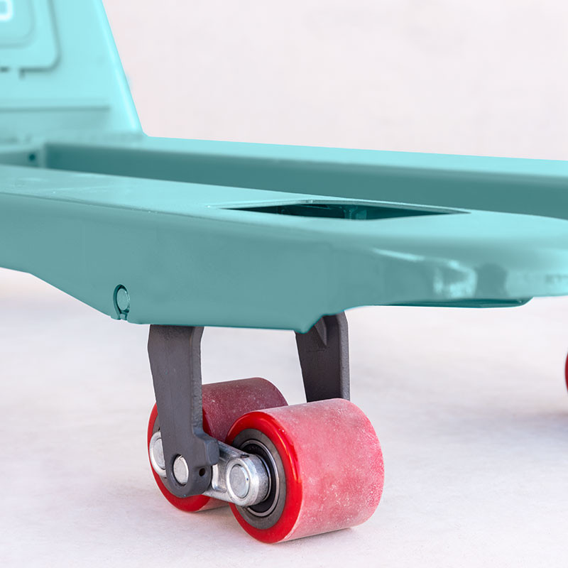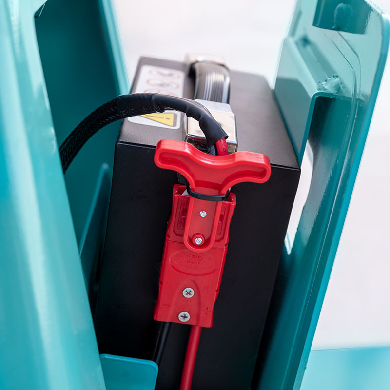 La transpaleta está equipada con ruedas de poliuretano (PU) una delantera y dos traseras dobles (4) que aseguran una tracción silenciosa y un desplazamiento suave incluso en superficies delicadas. La batería integrada de 24V / 20 kWh permite hasta 3 horas de uso continuo con un tiempo de carga total de solo 3 horas, lo que la convierte en una herramienta de trabajo eficiente para turnos cortos e intensivos.