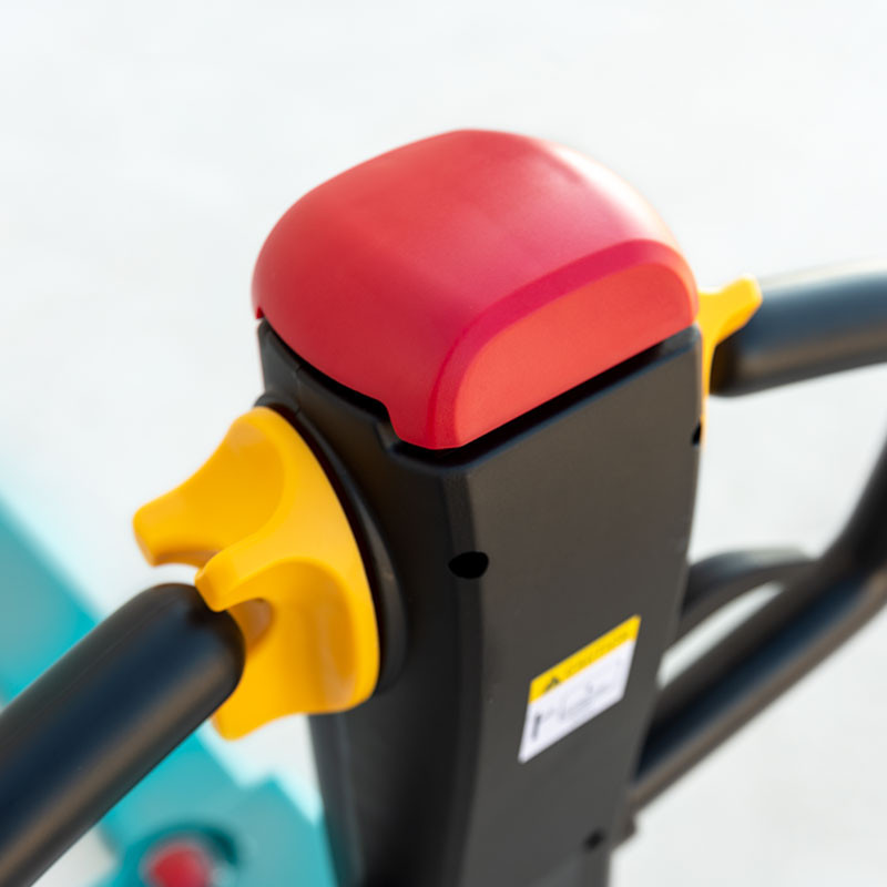 Gracias a su accionamiento eléctrico y a su sistema de control ergonómico con empuñadura multifunción, el operario puede elevar, descender o desplazar cargas con un simple gesto. La botonera intuitiva, el pulsador de parada de emergencia en color rojo, así como los controles de elevación y descenso bien diferenciados en amarillo, garantizan un manejo seguro y confortable.