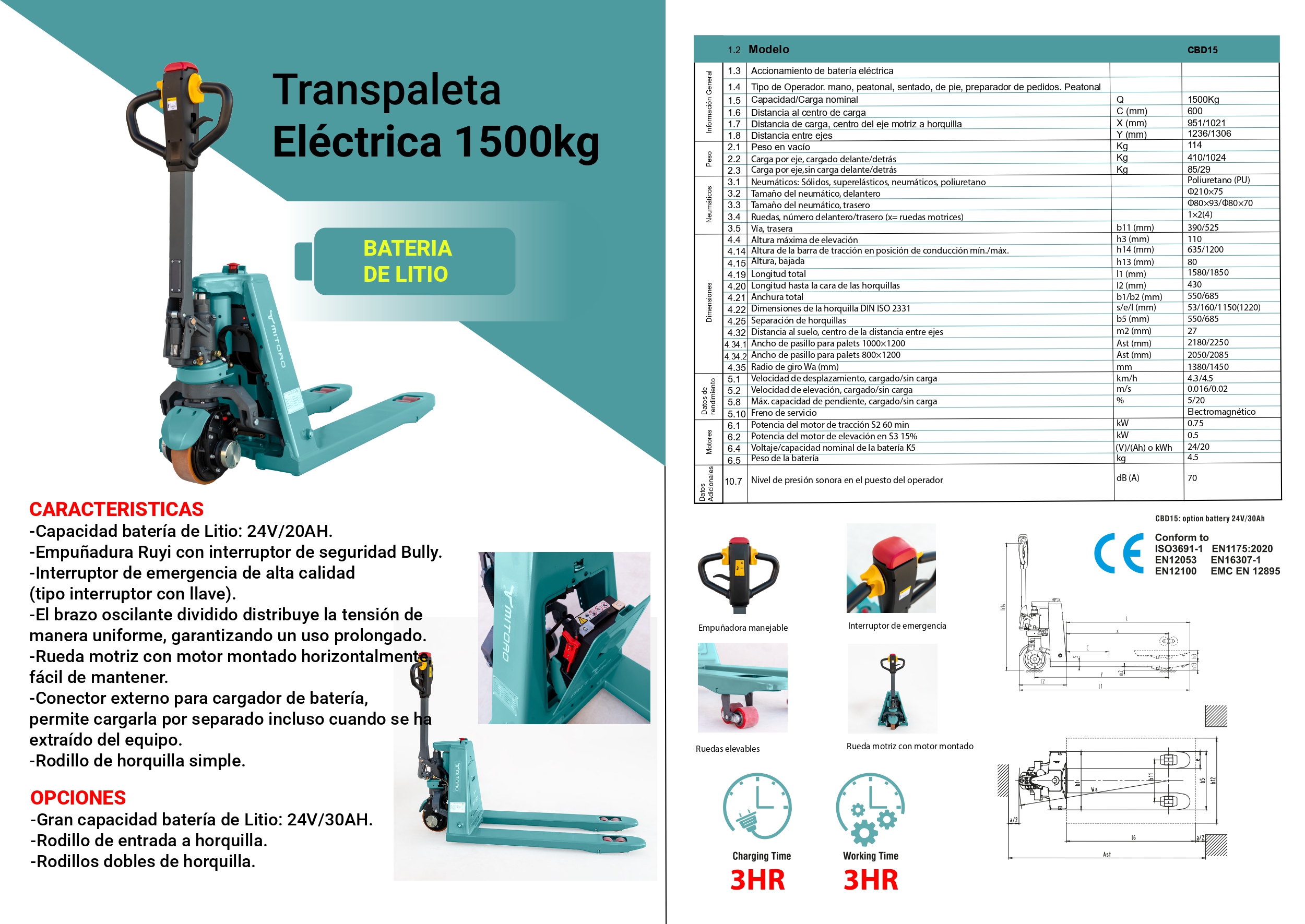 Características destacadas: Accionamiento: Eléctrico. Capacidad de carga: 1500 kg. Peso en vacío: 114 kg. Neumáticos: Poliuretano (PU). Número de ruedas: 1 rueda delantera y 2 ruedas dobles (4) traseras. Altura máxima de elevación: 110 mm. Altura mínima de las horquillas: 80 mm. Longitud total de las horquillas: 1580/1850 mm. Anchura total de las horquillas: 550/685 mm. Radio de giro Wa (mm): 1380/1450 mm. Velocidad de desplazamiento, cargado/sin carga: 4.3/4.5 km/h. Velocidad de elevación, cargado/sin carga: 0.016/0.02 m/s. Máx. capacidad de pendiente, cargado/sin carga: 5/20 %. Freno de servicio: Electromagnético. Potencia del motor de tracción S2 60 min: 0.75 kW. Potencia del motor de elevación en S3 15%: 0.5 kW. Voltaje/capacidad nominal de la batería K5: 24/20 kWh. Peso de la batería: 4.5 kg. Nivel de presión sonora en el puesto del operador: 70 db. Tiempo de carga: 3h. Tiempo de uso: 3h.