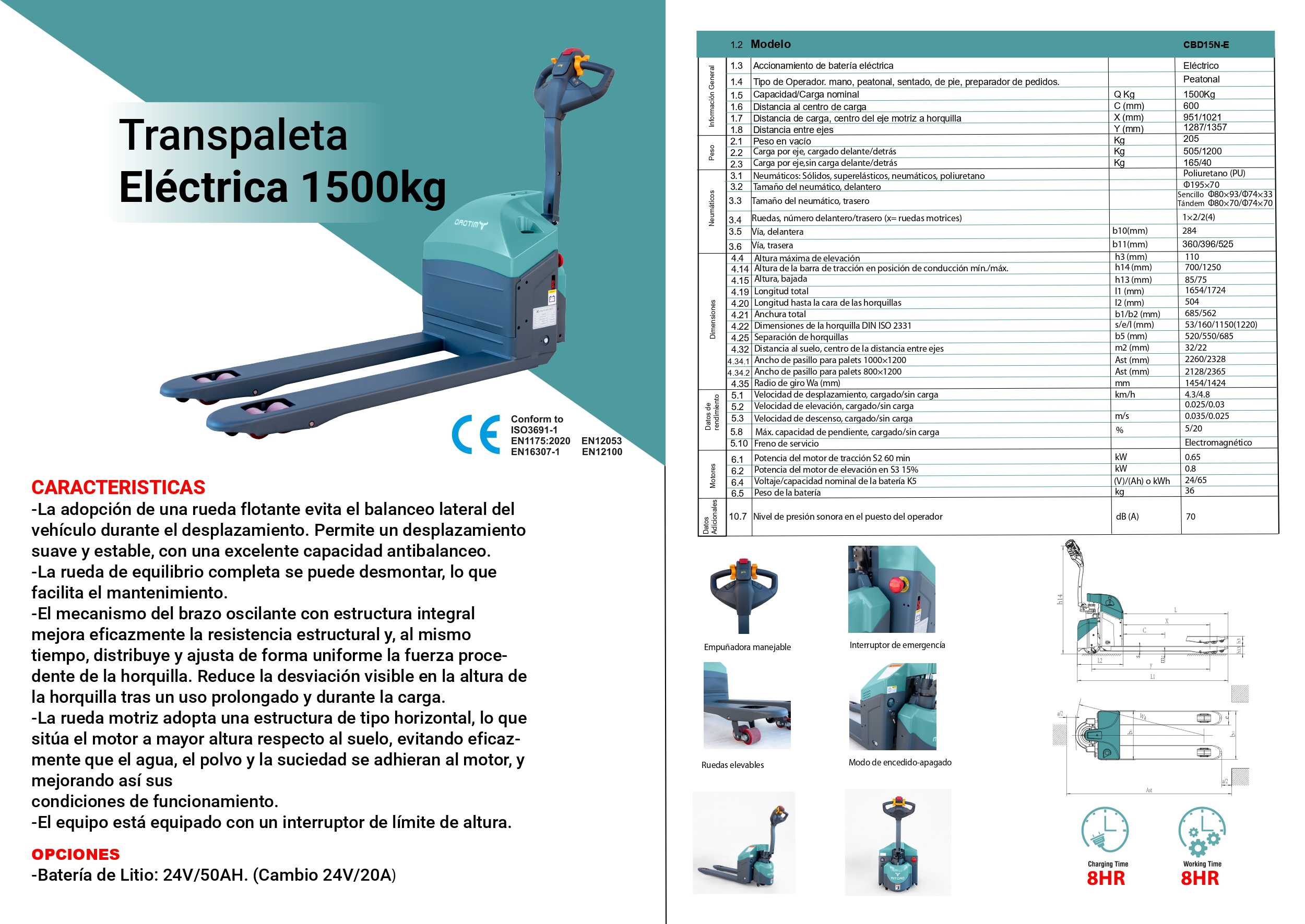 Características destacadas: Accionamiento: Eléctrico. Capacidad de carga: 1500 kg. Peso en vacío: 205 kg. Neumáticos: Poliuretano (PU). Número de ruedas: 2 ruedas motrices delanteras y 2 ruedas dobles (4) traseras. Altura máxima de elevación: 110 mm. Altura mínima de las horquillas: 75 mm. Longitud total de las horquillas: 1654/1724 mm. Longitud hasta la cara de las horquillas: 504 mm. Anchura total de las horquillas: 685/562 mm. Radio de giro Wa (mm): 1454/1424 mm. Velocidad de desplazamiento, cargado/sin carga: 4.3/4.8 km/h. Velocidad de elevación, cargado/sin carga: 0.025/0.03 m/s. Velocidad de descenso, cargado/sin carga: 0.035/0.025 m/s. Máx. capacidad de pendiente, cargado/sin carga: 5/20 %. Freno de servicio: Electromagnético. Potencia del motor de tracción S2 60 min: 0.65 kW. Potencia del motor de elevación en S3 15%: 0.8 kW. Voltaje/capacidad nominal de la batería K5: 24/65 kWh. Peso de la batería: 36 kg. Nivel de presión sonora en el puesto del operador: 70 db