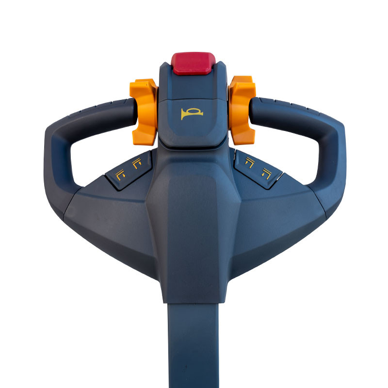 O guiador ergonómico com comandos intuitivos facilita a manobrabilidade e inclui um travão de serviço eletromagnético para paragens seguras. As velocidades de deslocação variam entre 4.3 km/h (com carga) e 4.8 km/h (sem carga), com velocidades de elevação e descida otimizadas para um funcionamento fluido.